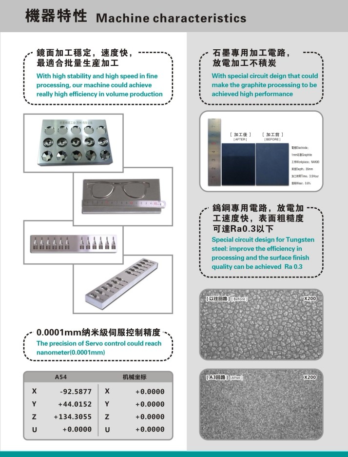 支持觸控顯示面板、USB 和網(wǎng)絡(luò)通信功能 石墨專用加工電路,加工不積炭 鏡面加工快速穩(wěn)定,適合批量生產(chǎn)